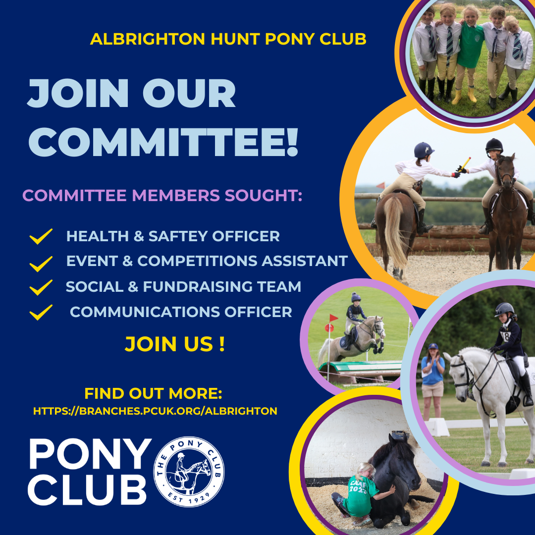 If you have any queries please email in the first instance: albrighton@pcuk.org. All the committee are volunteers many of whom have day jobs as well as Pony Club, but they will always do their very best to help.