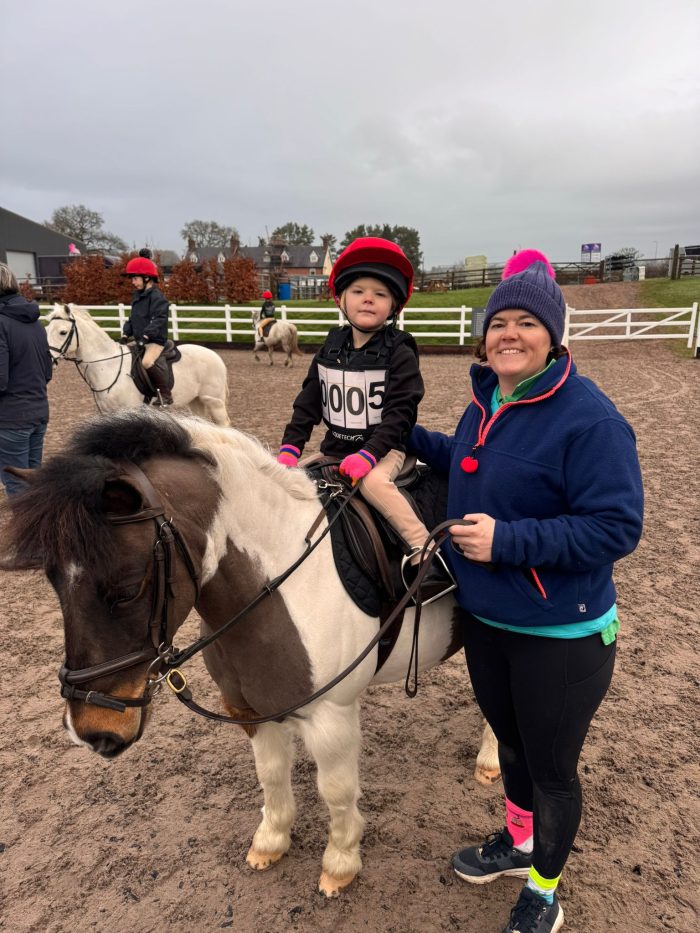 Today, February 1st, nineteen Flint and Denbigh members (mostly little and one big) supported the Cheshire Hunt South Dry Triathlon at Kelsall hill Equestrian Centre and they had a brilliant time. It was a well run competition at a superb venue. I arrived about 10am and it was very busy – so busy that I couldn’t manage to see them all doing their stuff. There were so many tiny people in tiny jods and tiny hats and parents doing the leading. As you can imagine there were some ‘unplanned dismounts’ but each child was checked for damage by the appointed First Aiders, before being allowed to continue. This is unique to Tetrathlon. The riding was actually impressive for such little people and the Open course was demanding.