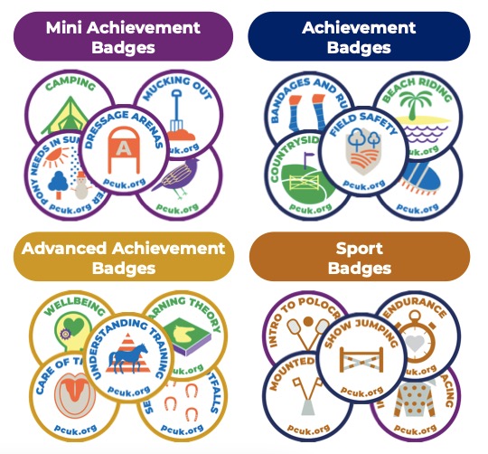 The Pony Club has a wide selection of badges that can be attained, ranging from grooming to camping, beach riding to countryside access. There are over 130 badges to collect which are available divided into four levels: